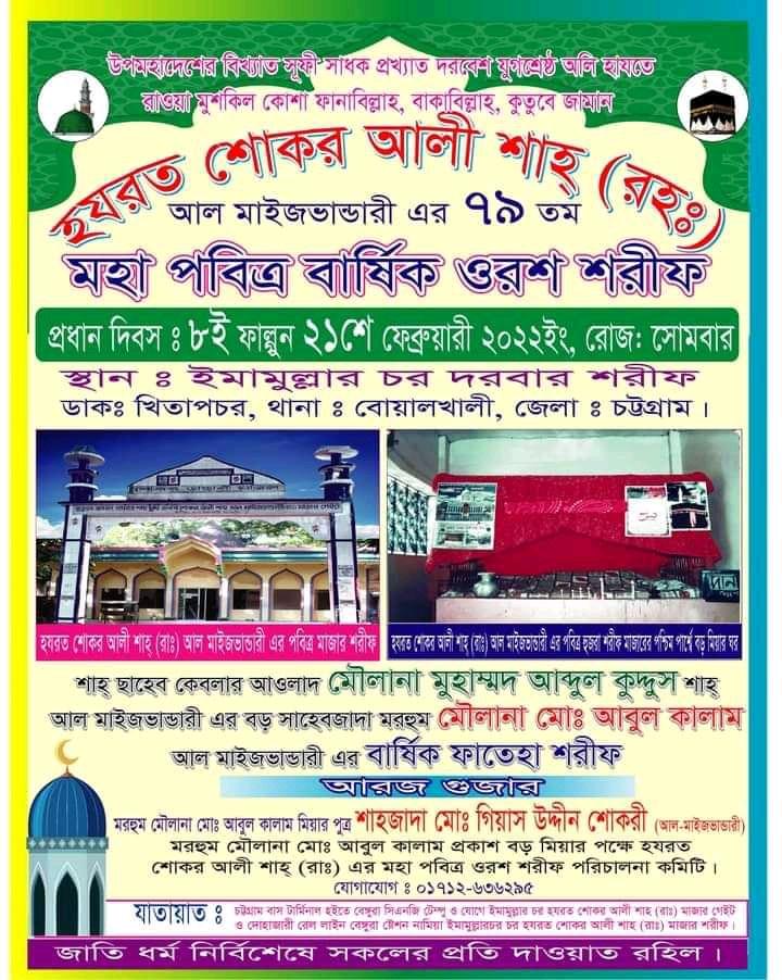 কুতুবে জামান জনাব কাজী আসাদ আলী সাহেব ক্বেবলা (রহঃ) এর খলিফা হযরত শোকর আলী শাহ (রহঃ) এর বার্ষিক ওরশ শরীফ আজ ২১ শে ফ্রেবুয়ারী ৮ ই ফাগুন সোমবার।