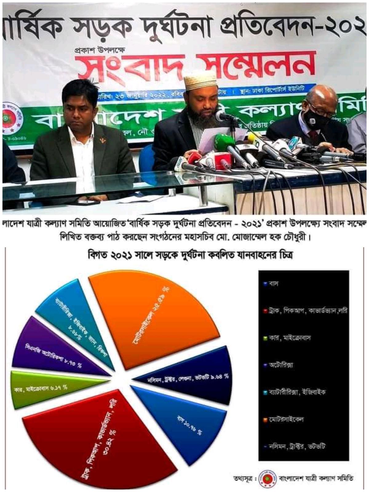 করোনা সংক্রমণ নিয়ন্ত্রনে ৮৫ দিন গণপরিবহন বন্ধ থাকার পরে ও বিদায়ী ২০২১ সালে ৫৬২৯ টি সড়ক দুর্ঘটনায় ৭৮০৯ জন নিহত, ৯০৩৯ জন আহত হয়েছে। একই সময় রেলপথে ৪০২ টি দুর্ঘটনায় ৩৯৬ জন নিহত, ১৩৪ জন আহত হয়েছে। নৌ-পথে ১৮২ টি দুর্ঘটনায় ৩১১ জন নিহত, ৫৭৮ জন আহত এবং ৫৪৪ জন নিখোঁজ হয়েছে। সড়ক, রেল, নৌ-পথে সর্বমোট ৬২১৩ টি দুর্ঘটনায় ৮৫১৬ জন নিহত এবং ৯৭৫১ জন আহত হয়েছে। বাংলাদেশ যাত্রী কল্যাণ সমিতির বার্ষিক সড়ক দুর্ঘটনা পর্যবেক্ষণ প্রতিবেদনে এই তথ্য উঠে এসেছে।