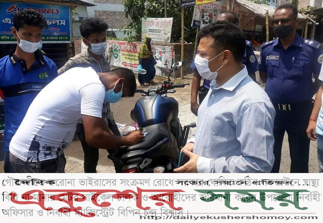 গৌরনদীতে স্বাস্থ্য বিধি না মানায় মোটর সাইকেল চালক ও আরোহীর ভ্রাম্যমাণ আদালতের জরিমানা