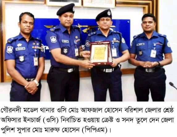 প্রসঙ্গ, গৌরনদী মডেল থানার শ্রেষ্ঠ অফিসার ইনচার্জ হিসেবে এ পূর্বেও ৫ বার মোঃ আফজাল হোসেন শ্রেষ্ঠত অর্জন করেন। শ্রেষ্ঠ অফিসার ইনচার্জ পূর্নরায় নিবার্চিত হওয়ায় বিভিন্ন মহল অভিনন্দন জানিয়েছেন।