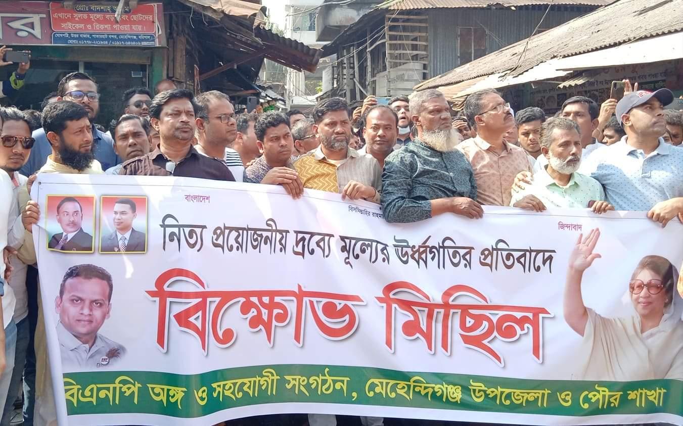 মেহেন্দিগঞ্জে নিত্যপ্রয়োজনীয় দ্রব্যমূল্যের ঊর্ধ্বগতির প্রতিবাদে বিএনপির বিক্ষোভ সমাবেশ।