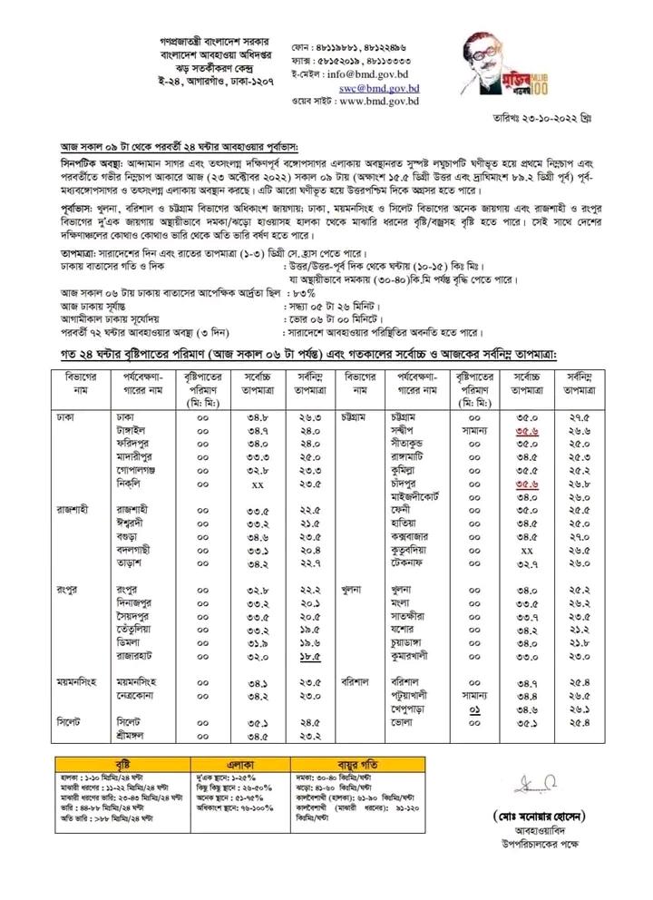 রবিবার (অক্টোবর ২৩) সকাল ৯টায় হতে পরবর্তী ২৪ ঘন্টার আবহাওয়ার পূর্বাভাসে বাংলাদেশ আবহাওয়া দফতরের নিজস্ব ওয়েবসাইটে উপপরিচালকের পক্ষে আবহাওয়াবিদ মোঃ মনোয়ার হোসেন স্বাক্ষরিত আবহাওয়ার বিশেষ বিজ্ঞপ্তি এতথ্য জানানো হয়েছে।