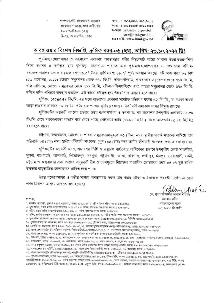 পূর্ব-মধ্যবঙ্গোপসাগর ও তৎসংলগ্ন এলাকায় অবস্থানরত গভীর নিম্নচাপটি আরো সামান্য উত্তর-উত্তরপশ্চিম দিকে অগ্রসর ও ঘণীভূত হয়ে ঘূর্ণিঝড় “সিত্রাং'-এ পরিণত হয়ে পূর্ব-মধ্য বঙ্গোপসাগর ও তৎসংলগ্ন পশ্চিম মধ্যবঙ্গোপসাগর এলাকায় (অক্ষাংশ: ১৬.৩° উত্তর, দ্রাঘিমাংশ: ৮৮.২° পূর্ব) অবস্থান করছে। এটি আজ সন্ধ্যা ০৬ টায় (২৩ অক্টোবর, ২০২২) চট্টগ্রাম সমুদ্রবন্দর থেকে ৭৭০ কি.মি. দক্ষিণপশ্চিমে, কক্সবাজার সমুদ্রবন্দর থেকে ৭১০ কি.মি. দক্ষিণপশ্চিমে, মোংলা সমুদ্রবন্দর থেকে ৭০০ কি.মি. দক্ষিণ-দক্ষিণপশ্চিমে এবং পায়রা সমুদ্রবন্দর থেকে ৬৭৫ কি.মি. দক্ষিণ-দক্ষিণপশ্চিমে অবস্থান করছিল। এটি আরো ঘণীভূত হয়ে উত্তর দিকে অগ্রসর হতে পারে। ঘূর্ণিঝড় কেন্দ্রের ৫৪ কি.মি. এর মধ্যে বাতাসের একটানা সর্ব্বোচ্চ গতিবেগ ঘণ্টায় ৬২ কি.মি. যা দমকা অথবা ঝড়ো হাওয়ার আকারে ৮৮ কি.মি. পর্যন্ত বৃদ্ধি পাচ্ছে। তাই চট্টগ্রাম, কক্সবাজার, মোংলা ও পায়রা সমুদ্রবন্দরসমূহকে ০৩ (তিন) নম্বর স্থানীয় সতর্ক সংকেত নামিয়ে তার পরিবর্তে ০৪ (চার) নম্বর স্থানীয় হুঁশিয়ারী সংকেত (পুন:) ০৪ (চার) নম্বর স্থানীয় হুঁশিয়ারী সংকেত দেখাতে বলা হয়েছে।