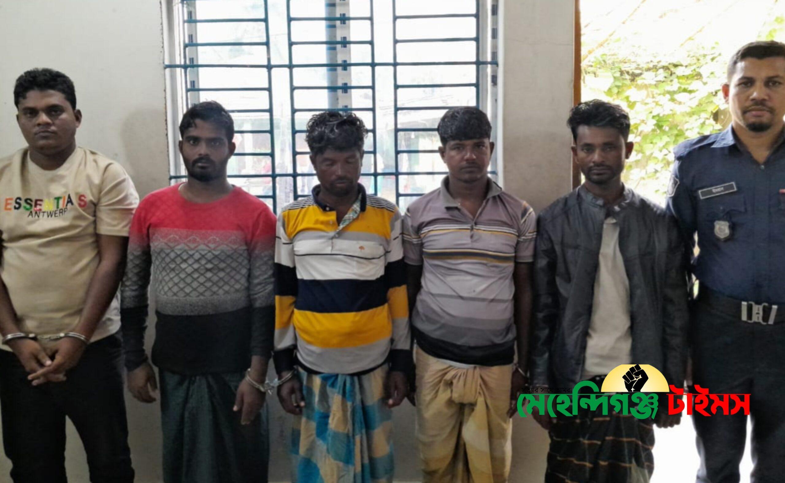 আটককৃতরা হলেন জাকির হোসেন, রাছেল, আলামিন, হোসেন ও নিরব। আটককৃতদের বিরুদ্ধে মেহেন্দিগঞ্জ থানায় বাল্কহেডের লস্কর মোঃ হৃদয় বাদী হয়ে একটি চাঁদাবাজি মামলা দায়ের করেন। মেহেন্দিগঞ্জ থানা মামলা নম্বর ৭। তারিখ ১০-১২-২০২৫ খ্রিষ্টাব্দ ধারা ৩৮৫/৩৮৬/৩৮৭/৩৪ পেনাল কোড।