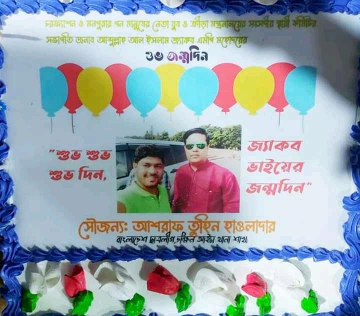 চরফ্যাশন ও মনপুরার উন্নয়নের বরপুত্র, দক্ষিণ বাংলার উন্নয়নের মহাকবি, গনপ্রজাতন্ত্রী বাংলাদেশ সরকারের পরিবেশ বন ও জলবায়ু পরিবর্তন বিষয়ক মন্ত্রনালয়ের সাবেক মাননীয় উপমন্ত্রী, গনপ্রজাতন্ত্রী বাংলাদেশ সরকারের যুব ও ক্রীড়া মন্ত্রনালয় সম্পর্কিত সংসদীয় স্থায়ী কমিটির সম্মানিত সভাপতি জননেতা আলহাজ্ব আবদুল্লাহ আল ইসলাম জ্যাকব এম পি মহোদয়ের জন্মদিন উদযাপন, করেছেন দক্ষিণ আইচা থানা ছাত্রলীগ নেতা আসরাফ তুহিন হাওলাদার, এসময়ে আসরাফ তুহিন এমপির সুস্বাস্থ্য কামনা করেছেন।