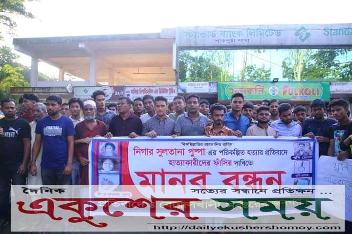 চট্টগ্রামের বোয়ালখালীর উপজেলায় দক্ষিণ চরখিজিরপুর এলাকার গৃহবধূ নিগার সুলতানা পুষ্পার হত্যাকারীদের ফাঁসির দাবিতে মানববন্ধন ও বিক্ষোভ মিছিল করেছে এলাকাবাসী। গতকাল (০১অক্টোবর) শুক্রবার বিকাল ৫টায় বোয়ালখালী উপজেলার শাকপুরা বাজার সংলগ্ন এলাকায় মানববন্ধন ও বিক্ষোভ মিছিল অনুষ্ঠিত হয়।