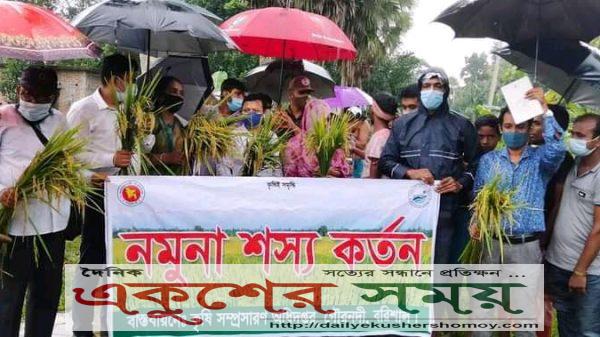 গৌরনদীতে উচ্চ ফলনশীল আউশ ধানের নমুনা শস্য কর্তন।