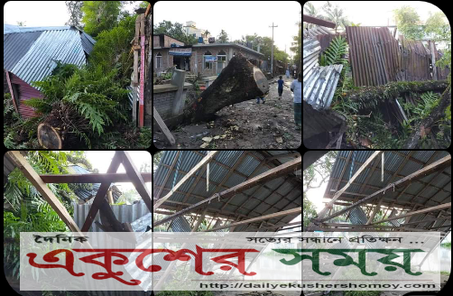মেহেন্দিগঞ্জের পাতারহাটে বন-বিভাগের গাছ উপড়ে পড়ে একাধিক দোকান-ঘর বিধ্বস্ত।