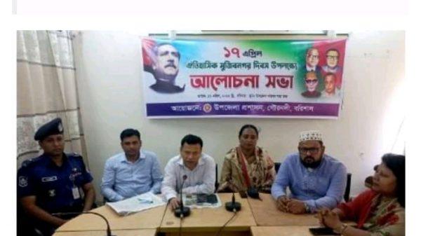 গৌরনদী (বরিশাল) প্রতিনিধিঃ বরিশালের গৌরনদীতে ১৭ এপ্রিল মুজিবনগর দিবস উপলক্ষে আলোচনা সভা অনুষ্ঠিত হয়েছে। উপজেলা প্রশাসনের উদ্যোগে রোববার সকালে উপজেলা পরিষদ হলরুমে আলোচনা সভা উপজেলা নির্বাহী অফিসার বিপিন চন্দ্র বিশ্বাসের